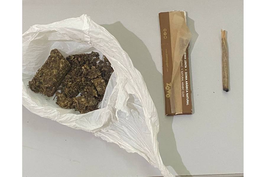 Abordagem confirmou a posse de substância análoga à maconha. Aproximadamente 100 gramas da droga, um cigarro pronto para consumo e uma seda para acondicionamento foram apreendidos no local. Durante checagem, descobriu-se que havia mandado de prisão em aberto contra o homem, reforçando a ação policial.