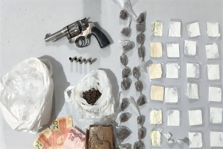 Durante a ação, policiais apreenderam 23 papelotes e 3 petecas de substância semelhante à cocaína, além de 20 trouxinhas e um tablete maior de maconha. Material incluía ainda uma sacola com droga, um revólver calibre .32, munições deflagradas e intactas, R$ 50 em espécie, celular Motorola branco e embalagens plásticas.