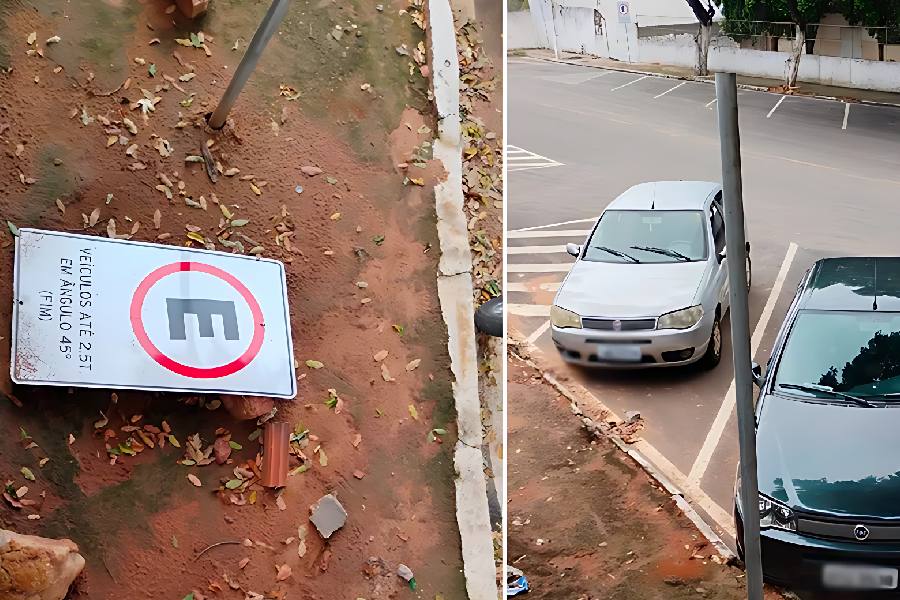 Leitor que registrou o fato alertou para a recorrência de danos a placas de sinalização no entorno do prédio público, situado em frente ao Rotary Club e à Casa da Amizade. Segundo ele, ações como essa prejudicam a orientação de condutores e podem provocar acidentes ou transtornos no fluxo de veículos.