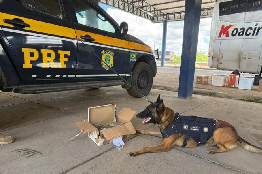 Cães indicaram substância ilícita em uma caixa de papelão lacrada com fita adesiva no compartimento de bagagens. Ao abrir o volume, policiais encontraram dois tabletes de maconha, totalizando aproximadamente 1,05 kg. A encomenda continha identificação de remetente e destinatário, comprovando envio do estado de São Paulo para a Bahia.