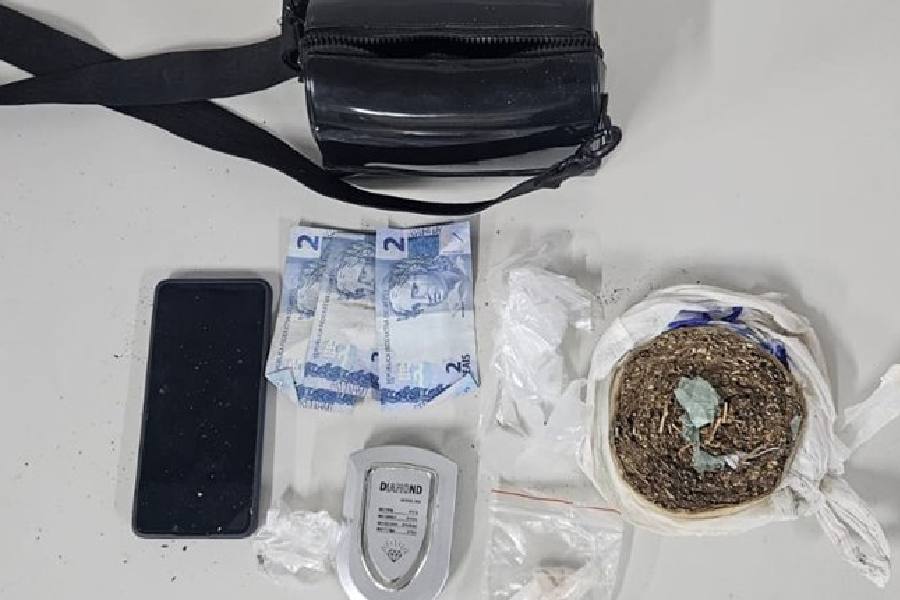 Durante revista, foram encontrados com a suspeita uma bolsa contendo substâncias análogas à maconha e à cocaína, além de balança de precisão, celular e R$ 6 em espécie. Objetos e entorpecentes foram apreendidos para investigação.