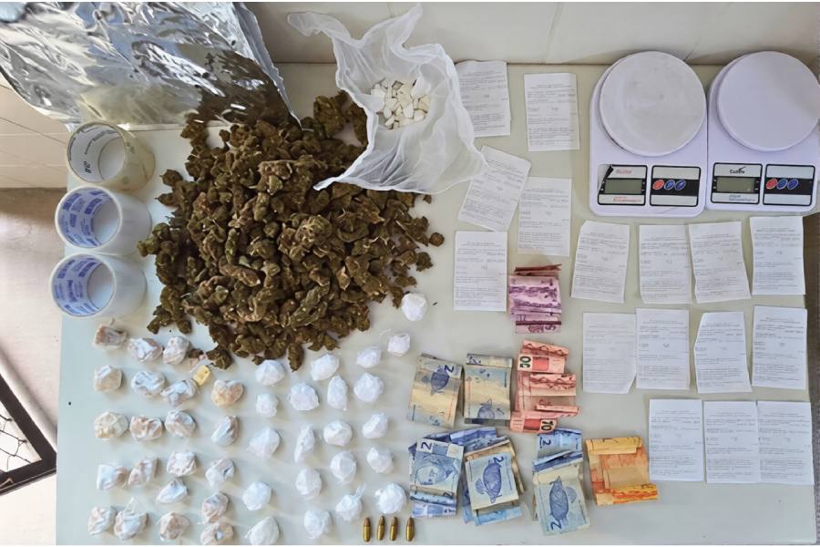 Durante abordagem, os policiais encontraram substâncias ilícitas com o suspeito. Ele indicou o local de origem da droga, onde foram apreendidos mais de meio quilo de maconha, porções de crack e cocaína fracionadas, comprimidos de ecstasy, munições de calibre 9mm, duas balanças de precisão, materiais para embalagem de entorpecentes, dinheiro em espécie e comprovantes de depósitos.