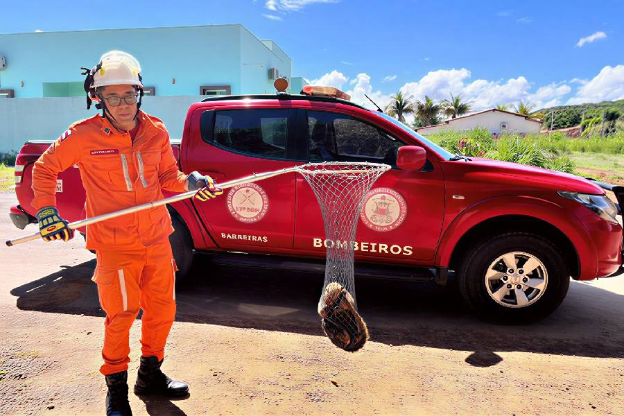 Atuação dos bombeiros foi marcada por técnica e cuidado durante toda a operação. Militares utilizaram equipamentos apropriados para realizar a captura de forma segura, evitando ferimentos e garantindo o bem-estar do animal silvestre.