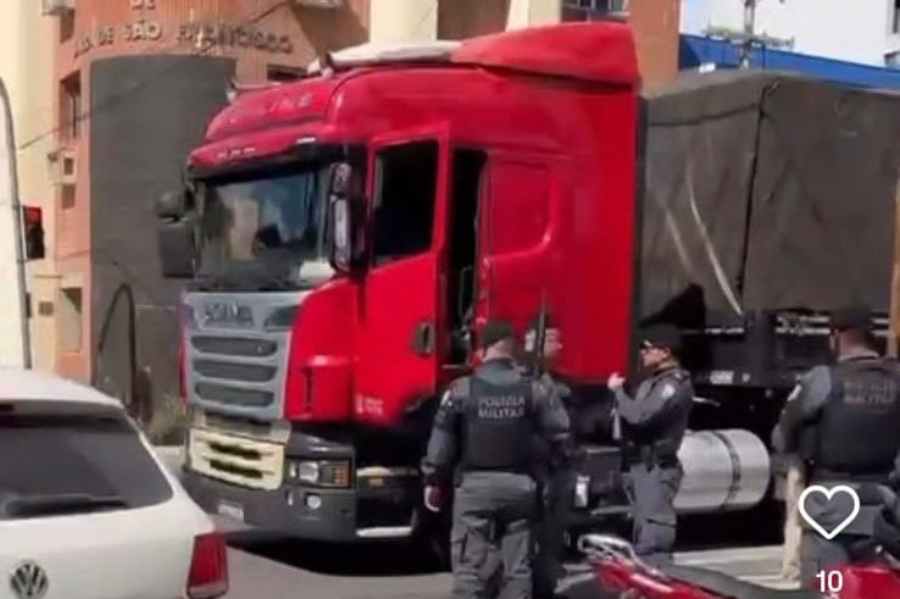 Homem identificado inicialmente como marido da mulher subiu na porta da carreta, quebrou o vidro com uma faca e tentou impedir a fuga do caminhoneiro. Cena foi registrada em vídeos que rapidamente circularam nas redes sociais, mostrando a tensão e a movimentação da população.