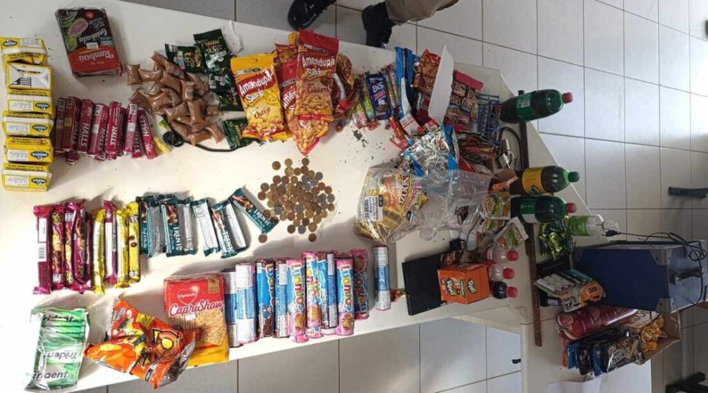 Ele foi encontrado pouco depois, acompanhado de comparsas, em posse de mercadorias furtadas. Entre os itens recuperados estavam alimentos, bebidas, chocolates, cigarros e balas. Os policiais também apreenderam moedas levadas do caixa, além de eletrônicos como uma caixa de som e um videogame.