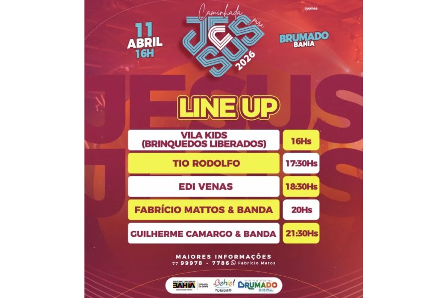 Evento religioso movimenta este sábado (11) em Brumado com uma programação voltada para toda a família. A organização da Caminhada para Jesus 2026 confirmou horários e atrações que devem atrair grande público ao longo da tarde e da noite. Abertura começa às 16h com a Vila Kids.