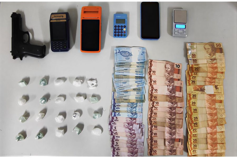 Além disso, equipe localizou um simulacro de arma de fogo, três máquinas de cartão e R$ 673 em dinheiro. Conjunto de objetos reforçou a suspeita de envolvimento com o comércio ilegal de drogas na região central da cidade.