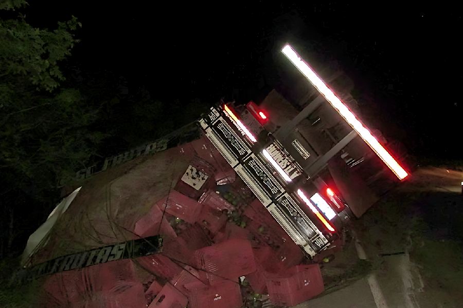 Um caminhão carregado com mangas tombou na noite de sábado (10) na BA-148, no trevo de acesso a Dom Basílio, no sudoeste da Bahia. O veículo saiu de Rio de Contas, na Chapada Diamantina, e seguia para Londrina. Após o acidente, o caminhão parou às margens da rodovia, espalhou parte da carga e exigiu atenção redobrada dos motoristas que passavam pelo local.