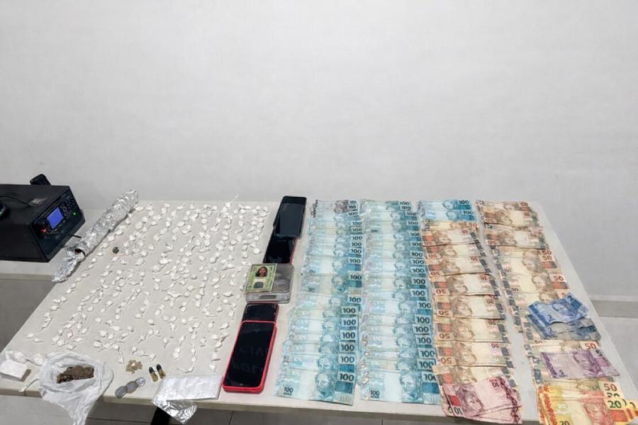 Entre os itens apreendidos estavam 260 porções de substância análoga à cocaína, que somaram cerca de 338 gramas, além de uma porção de maconha, duas munições calibre .38, uma balança de precisão e cinco aparelhos celulares.