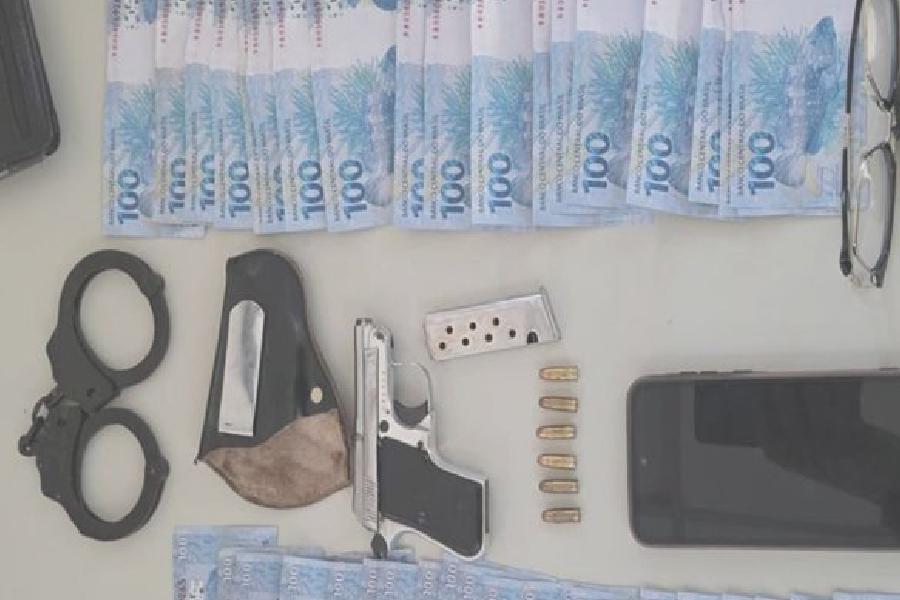 Além do armamento, a guarnição apreendeu 46 cédulas falsas de R$ 100, uma algema, um celular Samsung, carteira com documentos pessoais e cartões bancários. Duas malas com roupas e pertences também foram recolhidas, ampliando as suspeitas sobre a atuação do passageiro.
