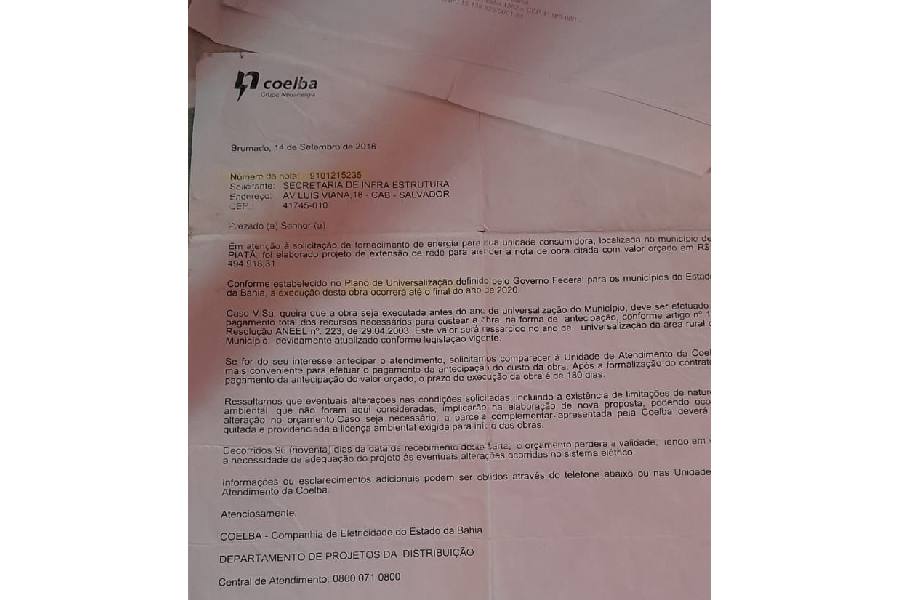 Espera prolongada revolta moradores da localidade de Extrema, na zona rural de Piatã, na Chapada Diamantina. Treze residências seguem sem energia elétrica desde 2018, quando foi protocolado pedido de extensão de rede junto à Coelba. A comunidade afirma que, após quase oito anos, nenhuma obra foi iniciada.