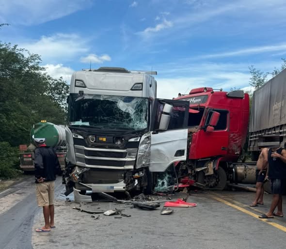 Trânsito parou na BR-242, na Serra da Mangabeira, em Oliveira dos Brejinhos, após colisão entre caminhões registrada por volta das 10h30. Impacto espalhou óleo e destroços na pista, gerando perigo para motoristas e exigindo rápida intervenção das equipes de emergência para conter riscos.