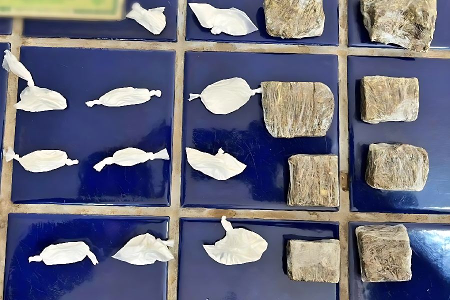 Durante a busca pessoal e a vistoria no imóvel, a equipe encontrou diversas porções de substâncias análogas à maconha e à cocaína. As drogas estavam armazenadas em um recipiente plástico, prontas para comercialização, segundo a PM. Todo o material foi apreendido para perícia.